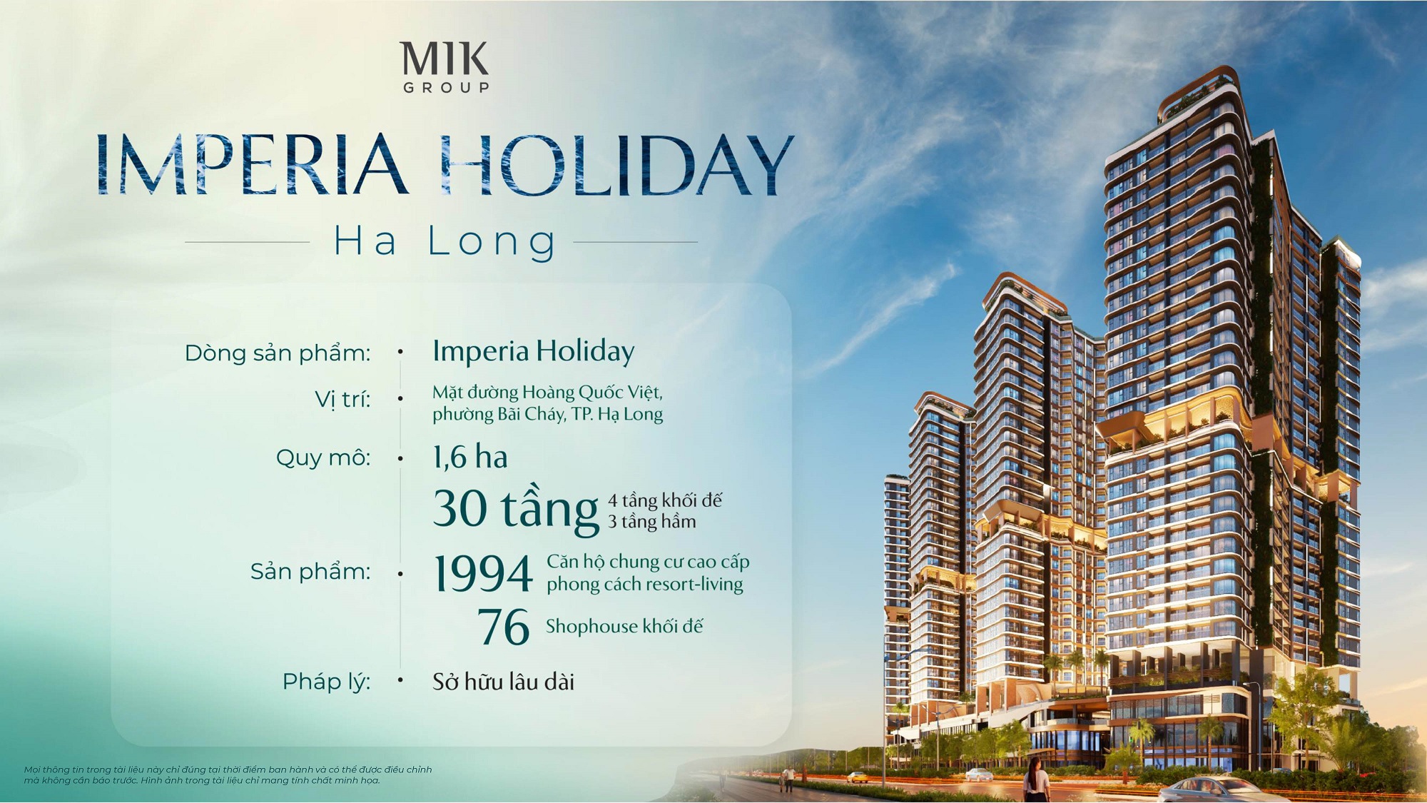 Imperia Holiday Hạ Long là tổ hợp thương mại – dịch vụ – căn hộ cao cấp do MIK Group phát triển tại trung tâm Bãi Cháy. Dự án tiên phong mô hình “resort-living” tại thành phố Hạ Long, mang đến không gian sống nghỉ dưỡng đẳng cấp. Tọa lạc trên trục đường Hoàng Quốc Việt sầm uất, dự án sở hữu vị trí vàng bên vịnh di sản. Với quy mô 1.994 căn hộ và 76 căn shophouse khối đế, dự án hứa hẹn trở thành điểm đến lý tưởng cho cả an cư lẫn đầu tư sinh lời bền vững.